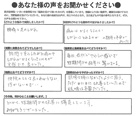 腰痛と足のしびれに対しての施術の感想文を頂きました。