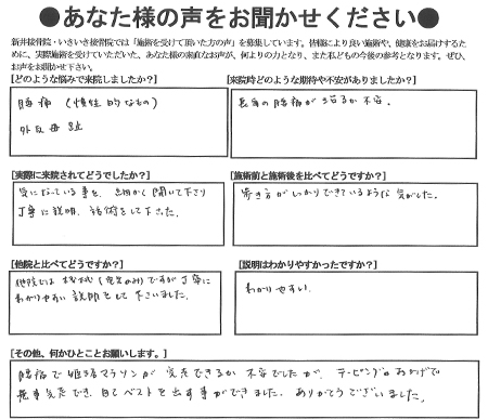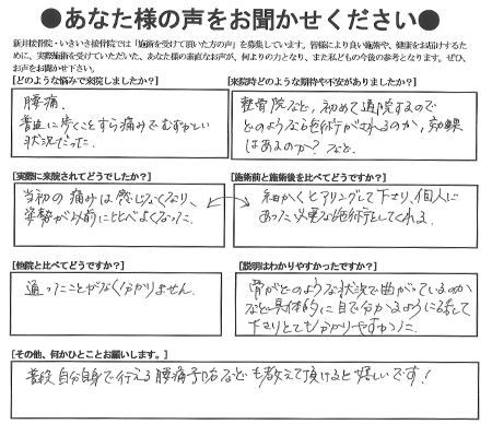 慢性腰痛の痛みを感じなくなり姿勢が良くなりました。