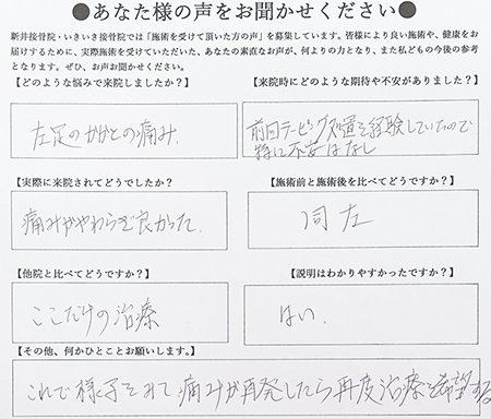こちらは、あくまでお客様、個人の感想ですので、必ずしも効果を保証するものではありません。かかとの痛みの施術を受けて頂いた方の声を頂きました。