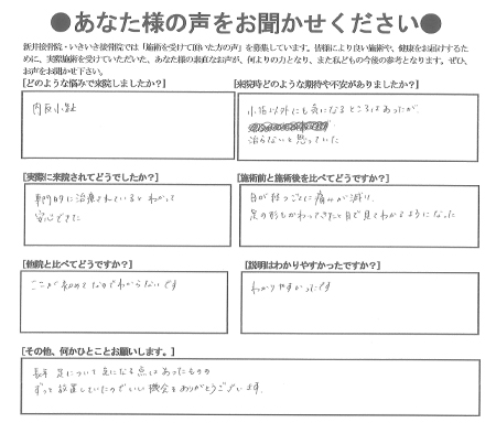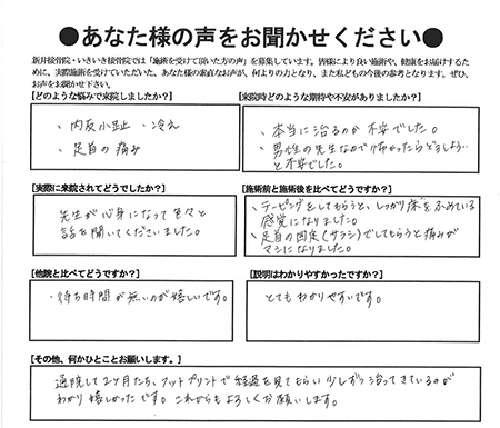 小指のつけ根の痛み(内反小趾)の施術を受けて頂いた方の感想を頂きました。