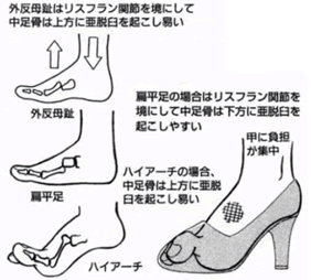 外反母指や偏平足の人は中足骨が下方に移動し、ハイアーチの人は上方に移動しそれぞれ亜脱臼している場合が多くなります。